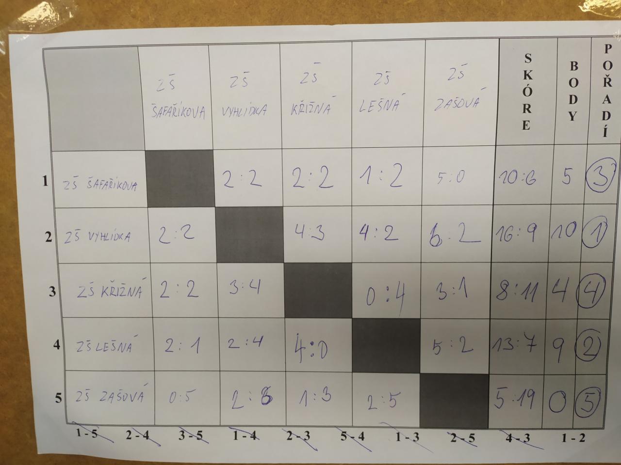 Turnaje se zúčastnilo celkem 5 základních škol. Žákyně hrály celkem 4 zápasy. Vyhrály tři z nich. Celkové skončily na 2. místě. Nejlepší střelkyní byla Karolína Kadlecová. Výborný výkon podala také Adéla Holubová v obraně a v bráně nás podržela Anna Slováková.