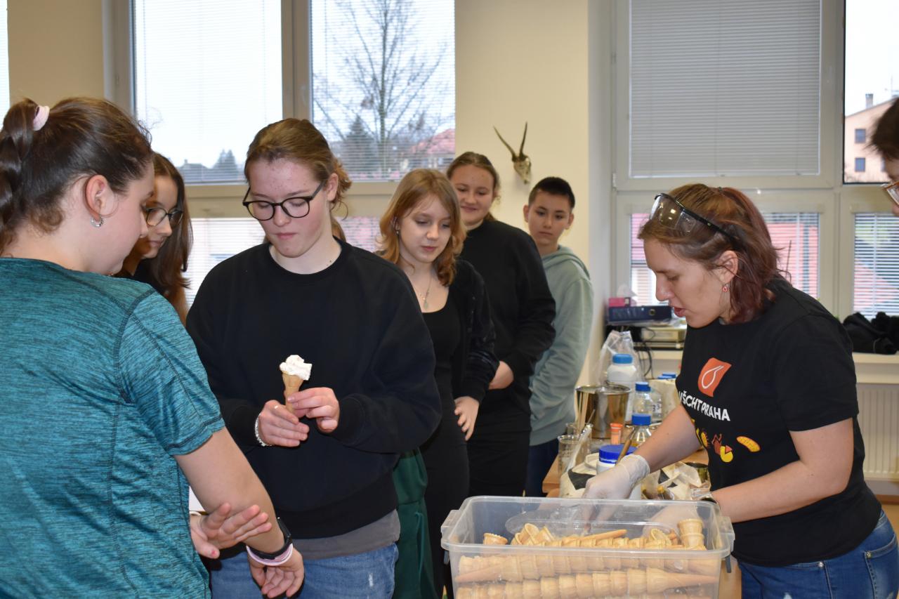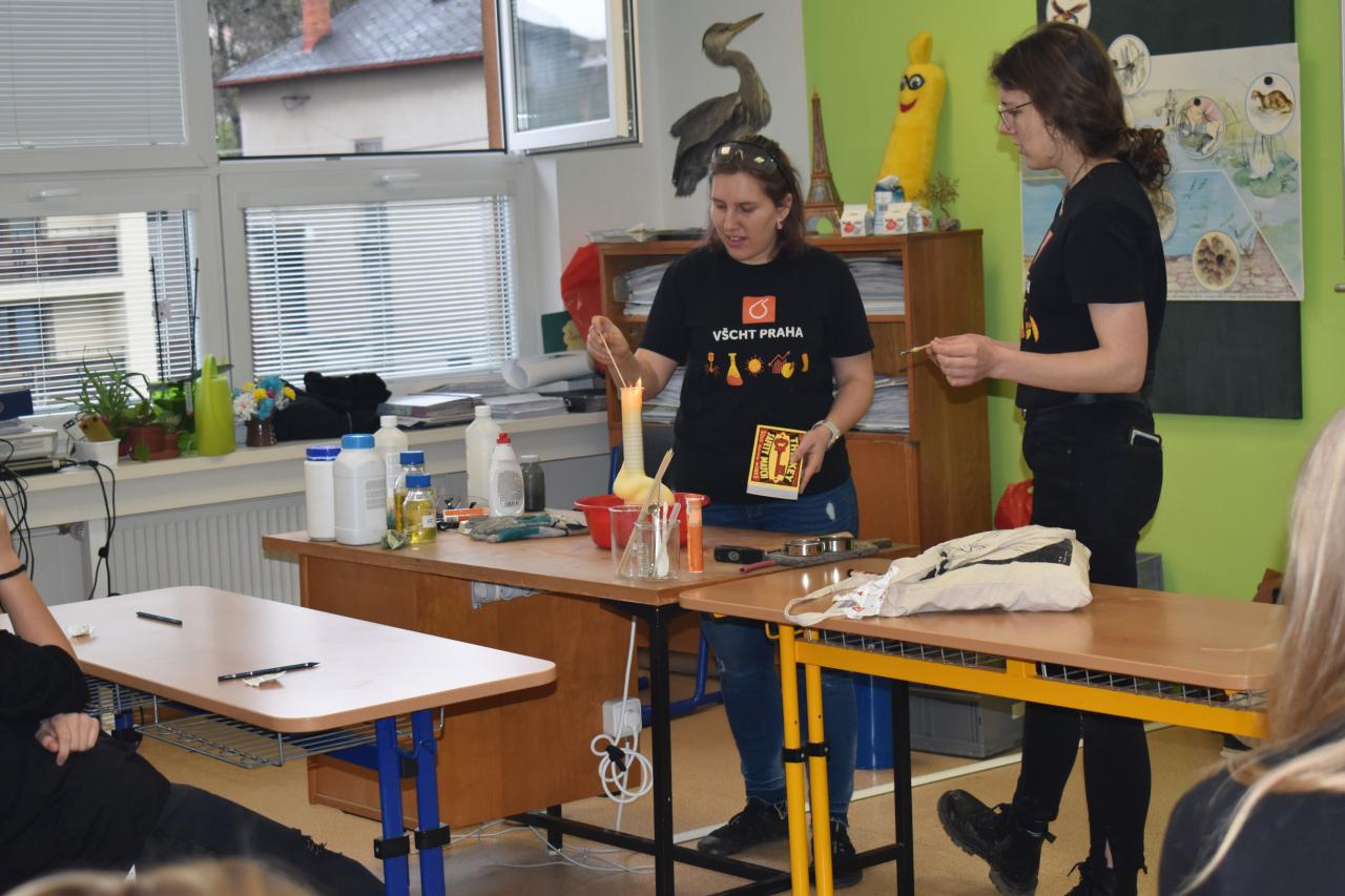 Dne 16. ledna měli žáci 8. a 9. třídy ve škole opravdu podívanou. V „Hodině moderní chemie“ pod vedením dvou studentek Vysoké školy chemicko-technologické v Praze měnily plameny barvu, střelný prach bouchal a jako dezert na konec všichni dostali přímo v hodině chemicky vyrobenou zmrzlinu.