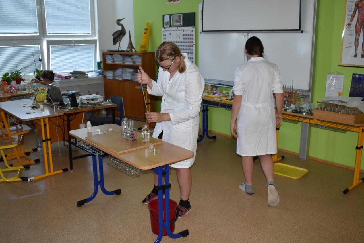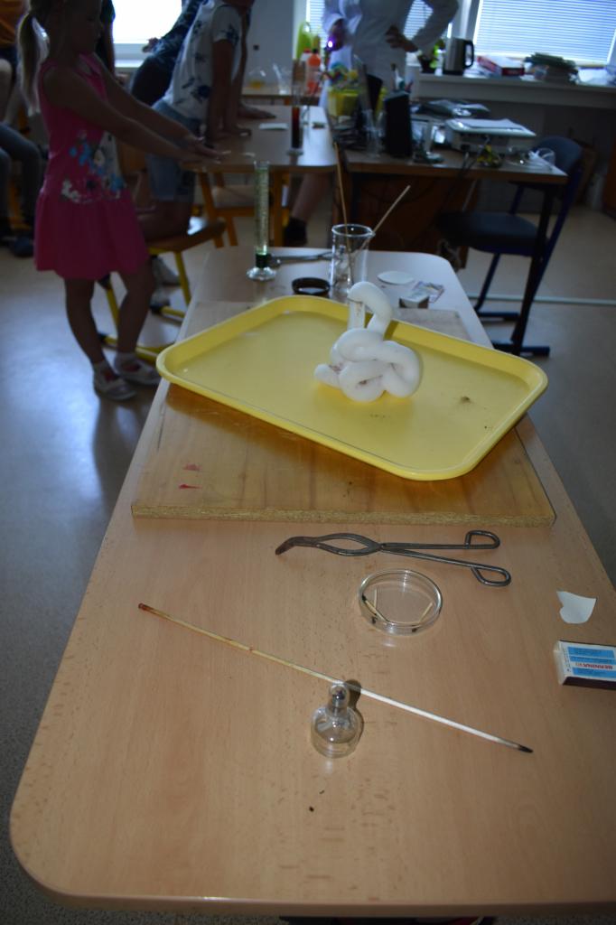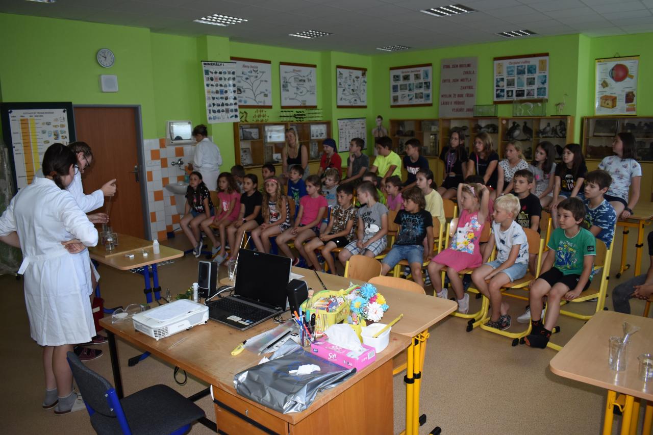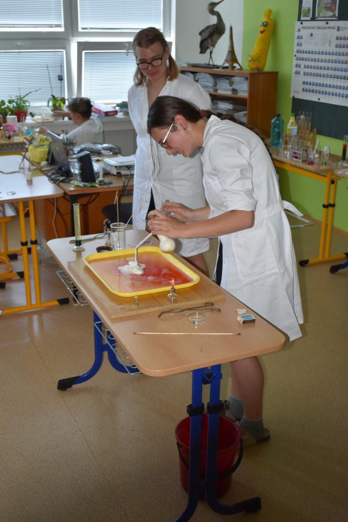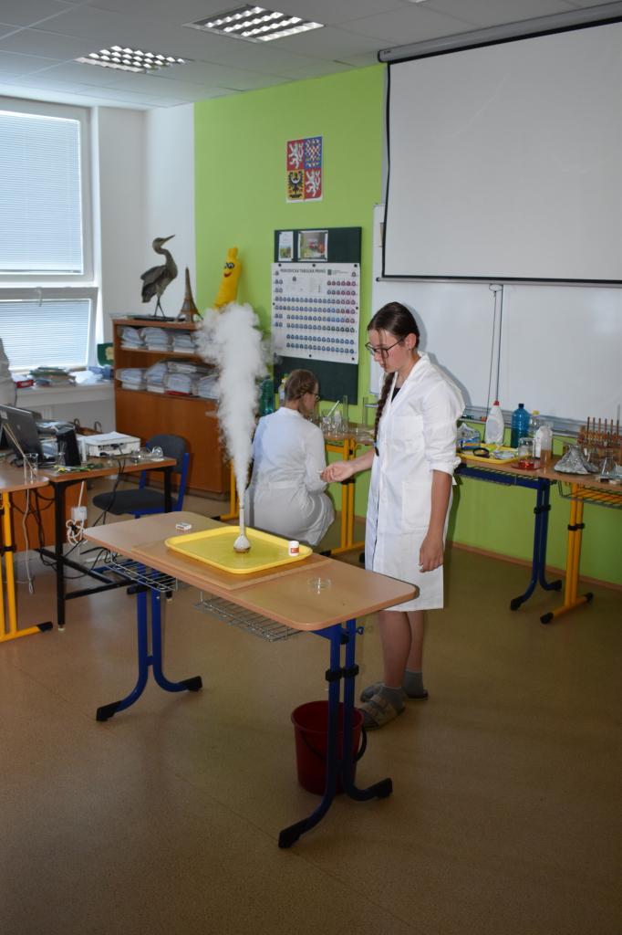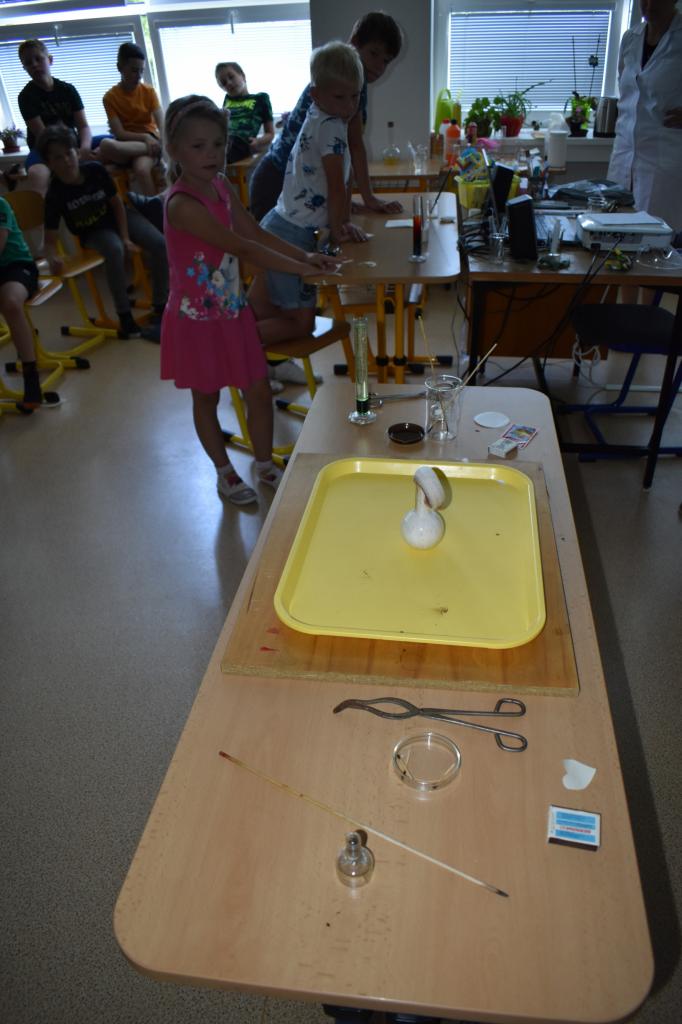 Dne 26. 6. 2023 (středa) žákyně 9. tř. (Natálie Pavlíková a Štěpánka Máslová) za dohledu mentorky Mgr. Lenky Holeňové připravily žákům 1. stupně zábavnou chemii.