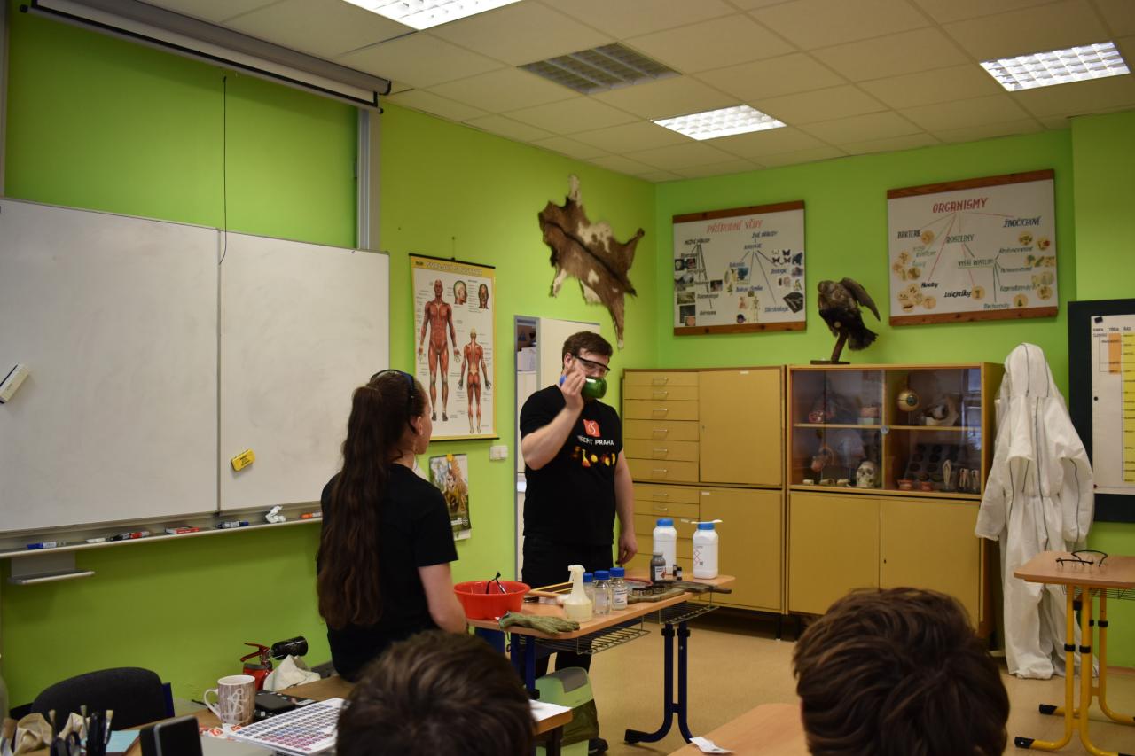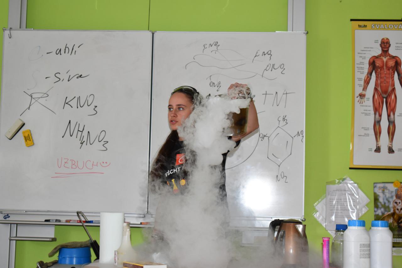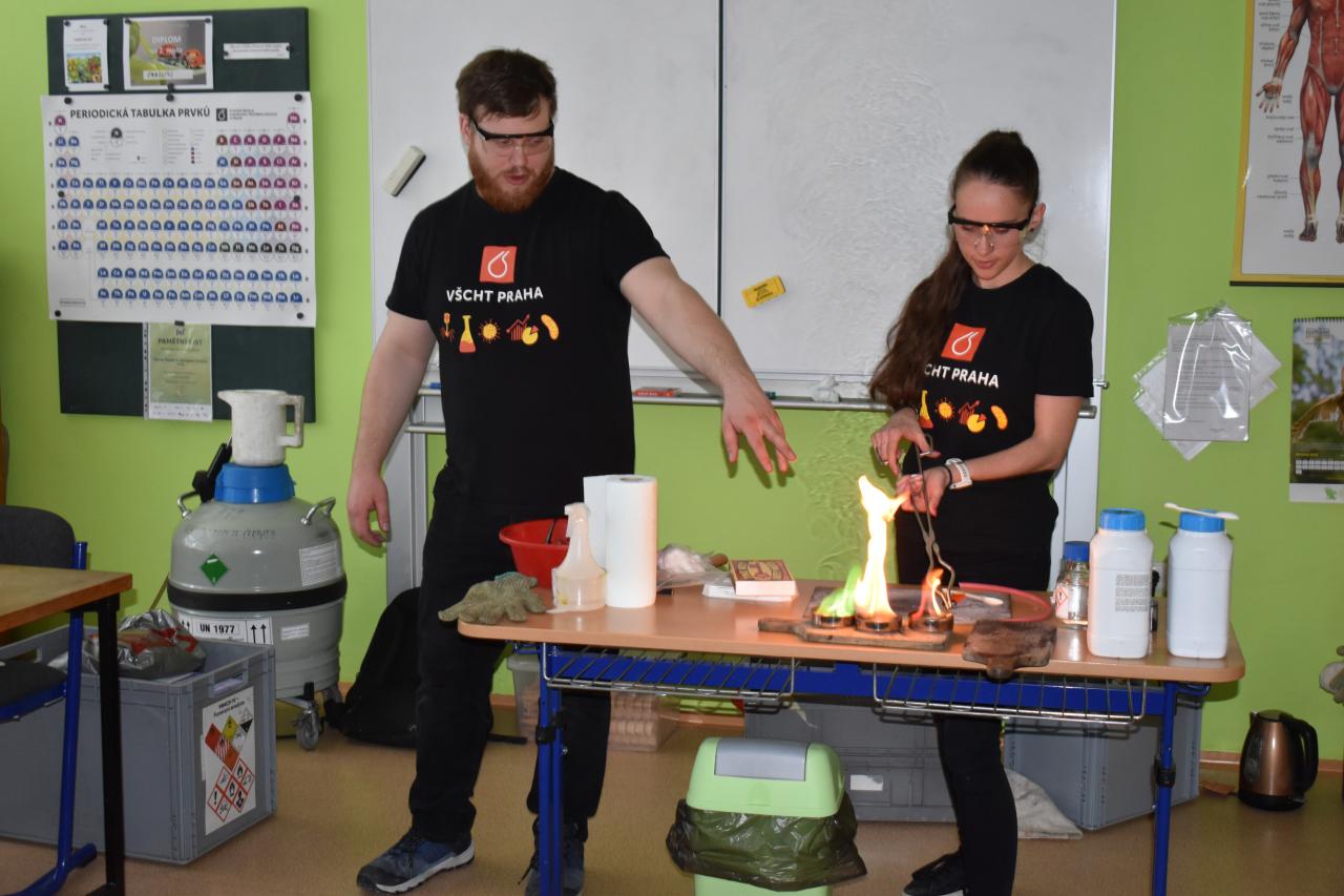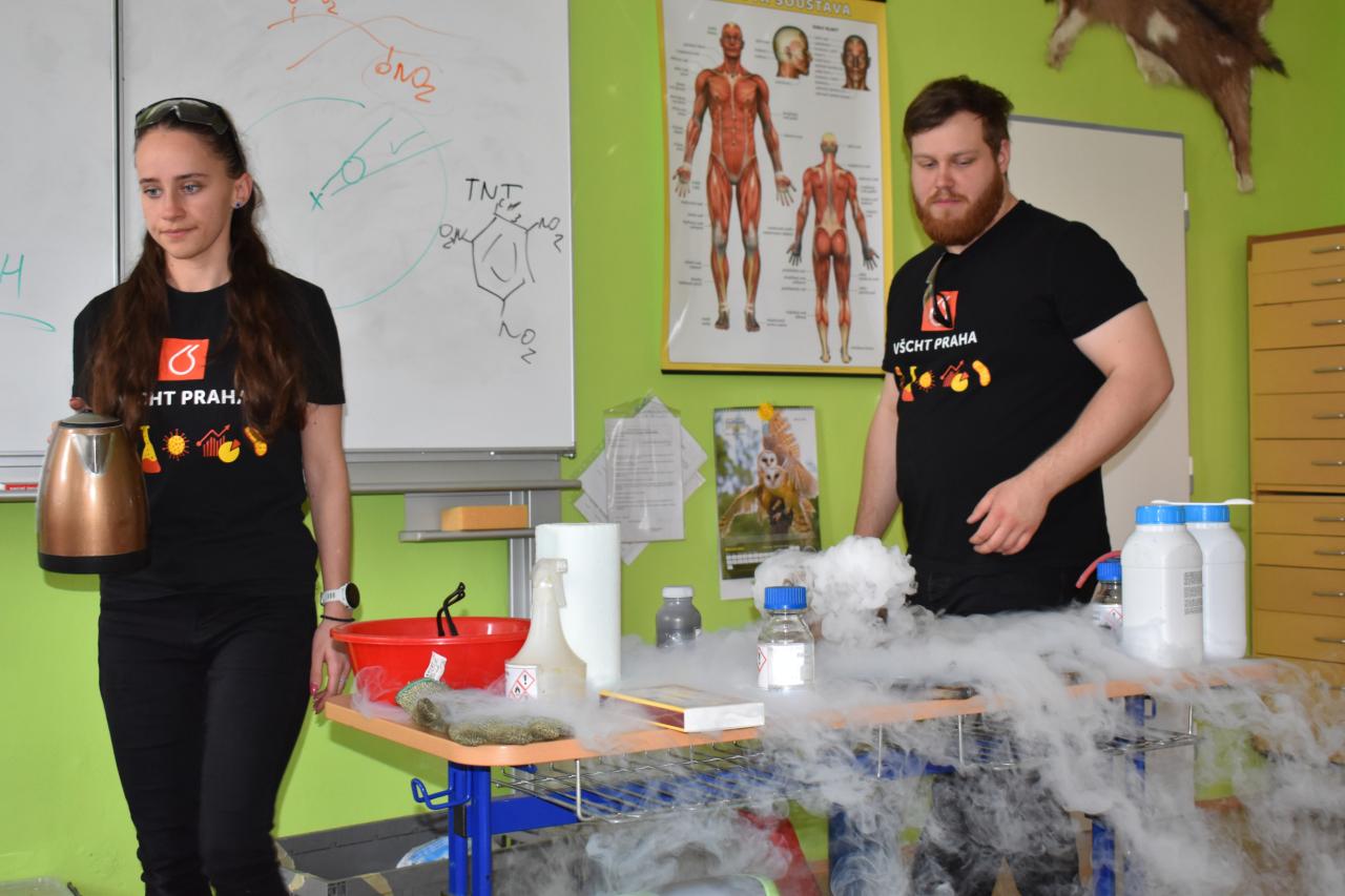 Dne 24. března měli žáci 8. a 9. třídy ve škole opravdu podívanou. V „Hodině moderní chemie“ pod vedením dvou studentů Vysoké školy chemicko-technologické v Praze zažili nevšední chemii se spoustou zajímavých pokusů, na konec dostali chemicky vyrobenou zmrzlinu.