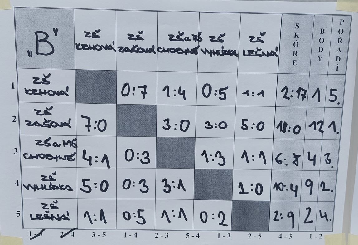 Turnaje se zúčastnilo celkem 10 základních škol, ty byly rozděleny do dvou základních skupin. Náš tým se ve skupině utkal se ZŠ Krhová, ZŠ Zašová, ZŠ a MŠ Choryně a ZŠ Vyhlídka. Ve skupině jsme dvakrát remizovali a dvakrát prohráli.